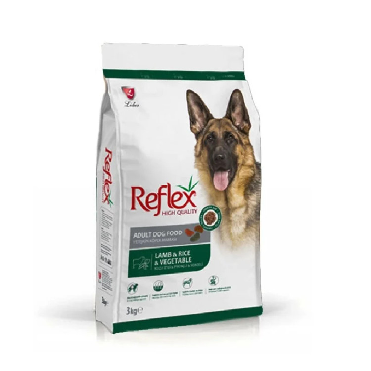 غذای سگ بالغ رفلکس (Reflex) با طعم گوشت و برنج و سبزیجات که مخصوص تمامی سگهای نژاد متوسط و بزرگ می باشد .گیاه یوکا با کنترل بو و امونیاک جذب مواد غذایی را افزایش می دهد وسیستم بدن سگ را تقویت نموده و باعث رشد وعملکرد سگ دلبند شما می شود .الیگوسارید موجود در این محصول باعث سلامت و عملکرد خوب روده و بتاگلوکانها باعث تقویت سیستم ایمنی می شود .وجود مخمر آبجو برای حفظ سلامت پوست و موهای براق پت شمابسیار موثر است و همچنین پودر آب پنیر باعث تقویت عضلات و اندام و سلولهای عصبی میشود. این محصول غنی شده باو یتامینها و مواد معدنی است.