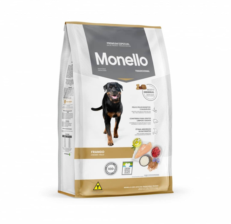 غذای خشک سگ مونلو (Monello) مدل تردیشنال از گوشت مرغ و گوشت قرمز به همراه دانه های کتان، برنج و روغن زیتون تهیه شده است. این غذا با قابلیت هضم بالا است تا حیوانات خانگی انرژی و نشاط بیشتری داشته باشند. پروتئین های با کیفیت بالای این غذا و افزودن مانان-الیگوساکارید (MOS)، و پری بیوتیک که باعث جذب مواد مغذی و سلامت روده می شود، رشد سالم و سلامت حیوان خانگی را تضمین می کند. غذای سگ مونلو تولید کشور برزیل است.
